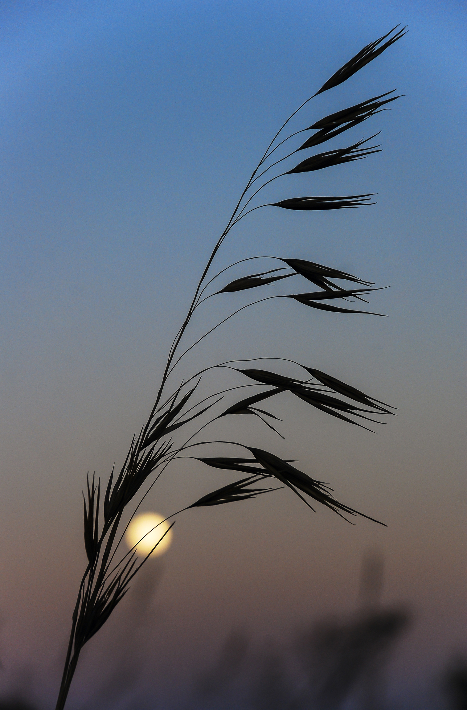 Entardecer no Parque Nacional das Emas, evidenciando-se em primeiro plano a silhueta do capim-flecha (Tristachya leiostachya), gramínea típica daquela unidade de conservação. |